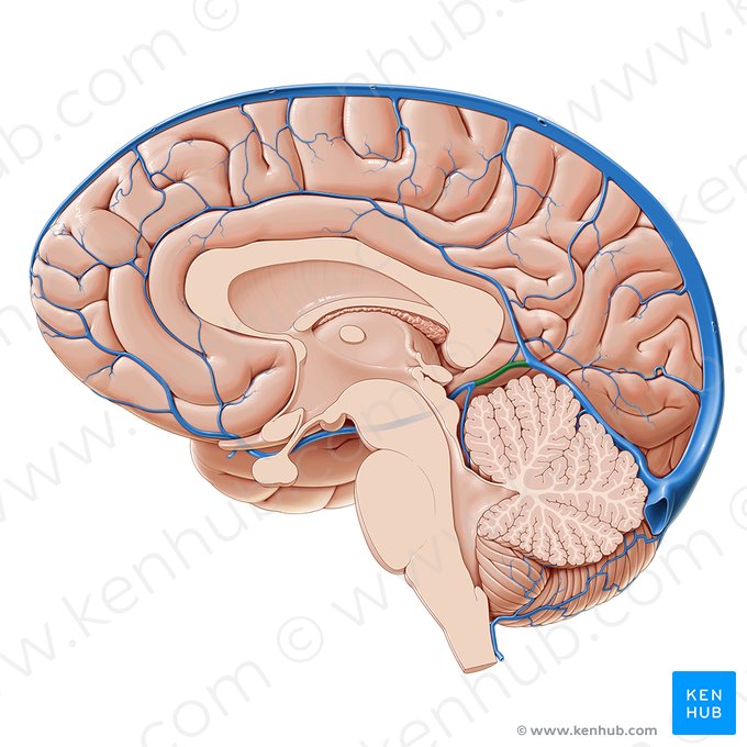 O sistema venoso profundo é formado por uma série de seios venosos e veias cerebrais profundas. Várias veias medulares se estendem pela substância branca do cérebro e drenam para as veias subependimárias, ao longo da superfície interna dos ventrículos laterais, levando à formação de veias cerebrais maiores, principalmente as veias cerebrais internas, a veia basilar (de Rosenthal) e a veia cerebral magna (de Galeno). As veias subependimárias e as veias medulares profundas drenam para os seios durais, que por sua vez drenam para a veia jugular interna.
