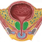 Continuando, temos a primeira das três glândulas acessórias dos órgãos reprodutores internos masculinos. As duas vesículas seminais, também conhecidas como glândulas seminais, são estruturas alongadas e orientadas obliquamente localizadas entre a bexiga e o reto. É importante ressaltar que as vesículas seminais não armazenam espermatozoides. Em vez disso, elas secretam fluido seminal, um fluido alcalino rico em frutose que se mistura com o esperma quando se encontra com ele no ducto ejaculatório. Esse fluido fornece energia aos espermatozoides, além de atuar como um revestimento para neutralizar a acidez da vagina e do muco cervical. Essas secreções das vesículas seminais constituem cerca de 70% do volume ejaculado.
